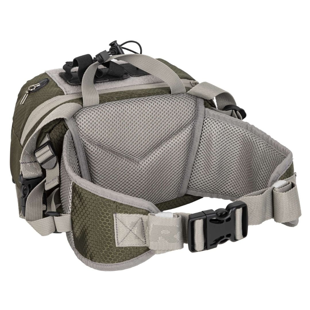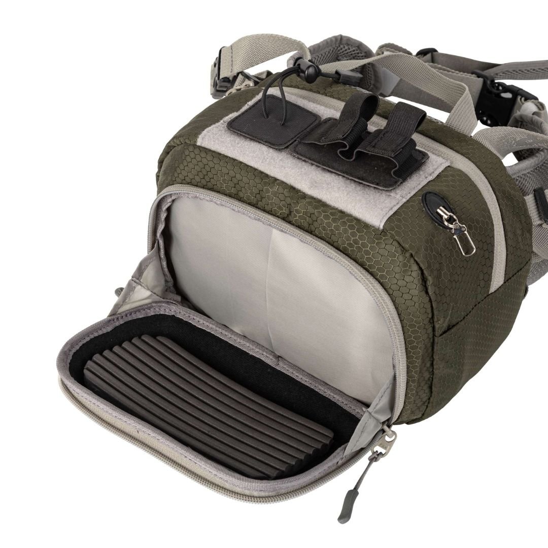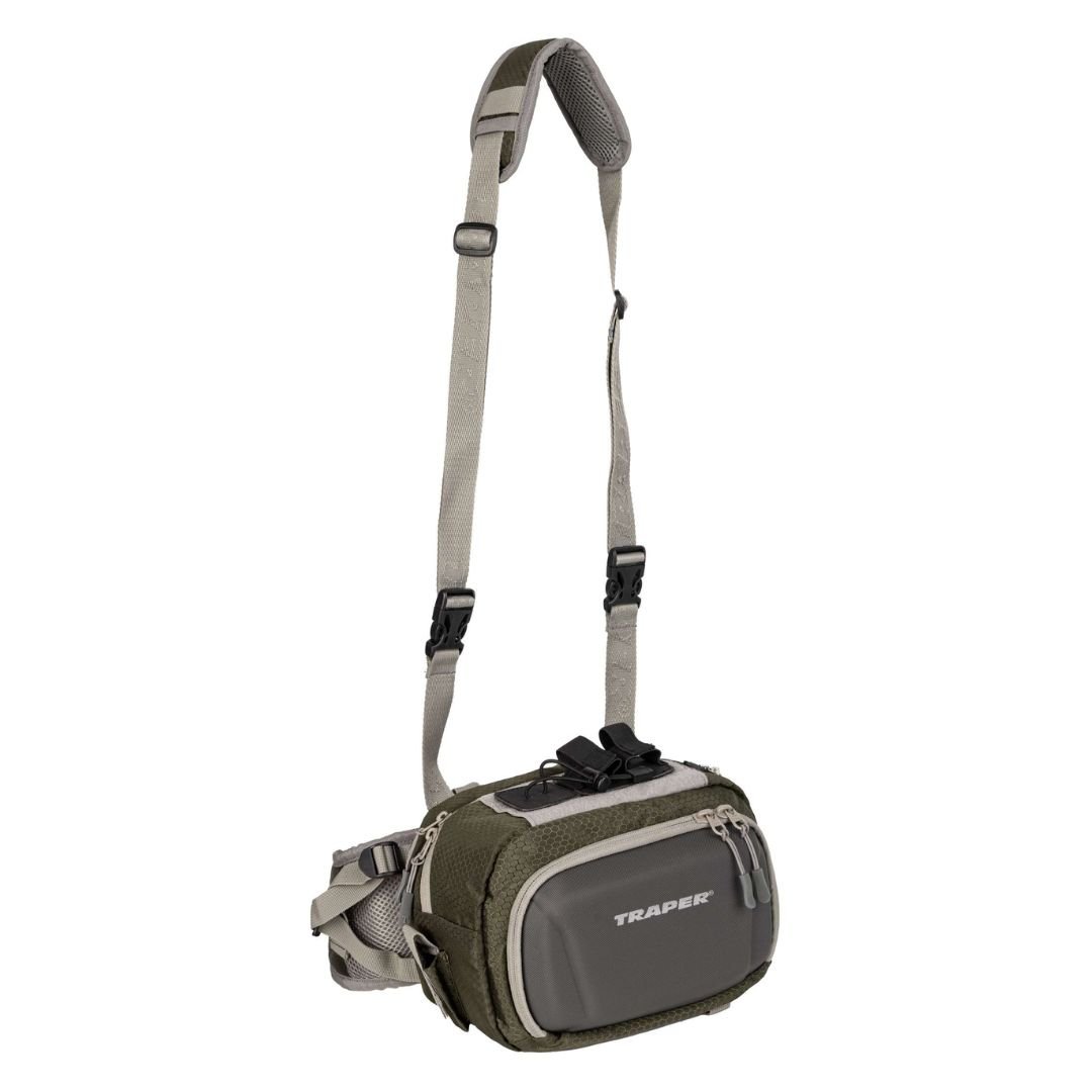 Per liemenį tvirtinamas krepšys, leisiantis susidėti svarbiausius dalykus sėkmingai dienos žvejybai. Dvi dalys – didelė pagrindinė dalis su kišenėmis ir priekinė dalis su musių laikikliu. Išorėje gertuvės laikiklis, išsitraukiantis karabinas aksesuarams ir žnyplių laikiklis.